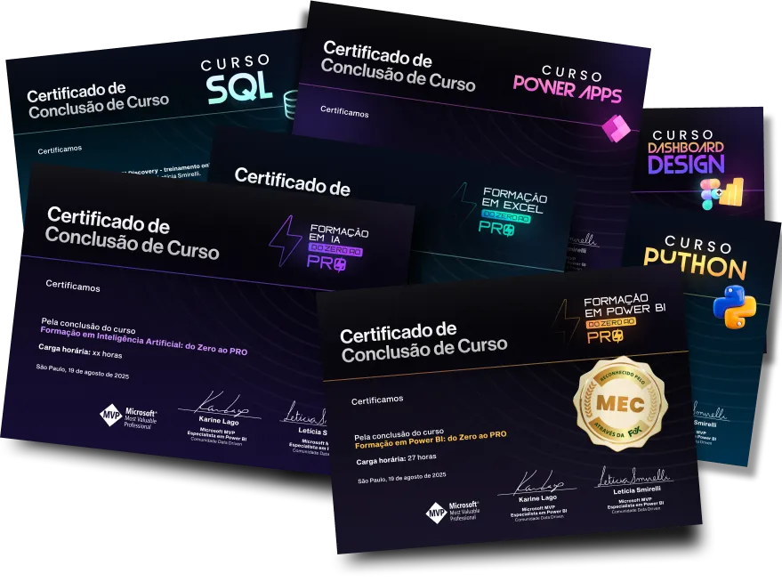 Cada Formação concluída é um certificado a mais no seu currículo, comprovando suas habilidades em Inteligência Artificial, Excel, Power BI (reconhecido como extensão universitária pelo MEC), SQL, Apresentações e muito mais.